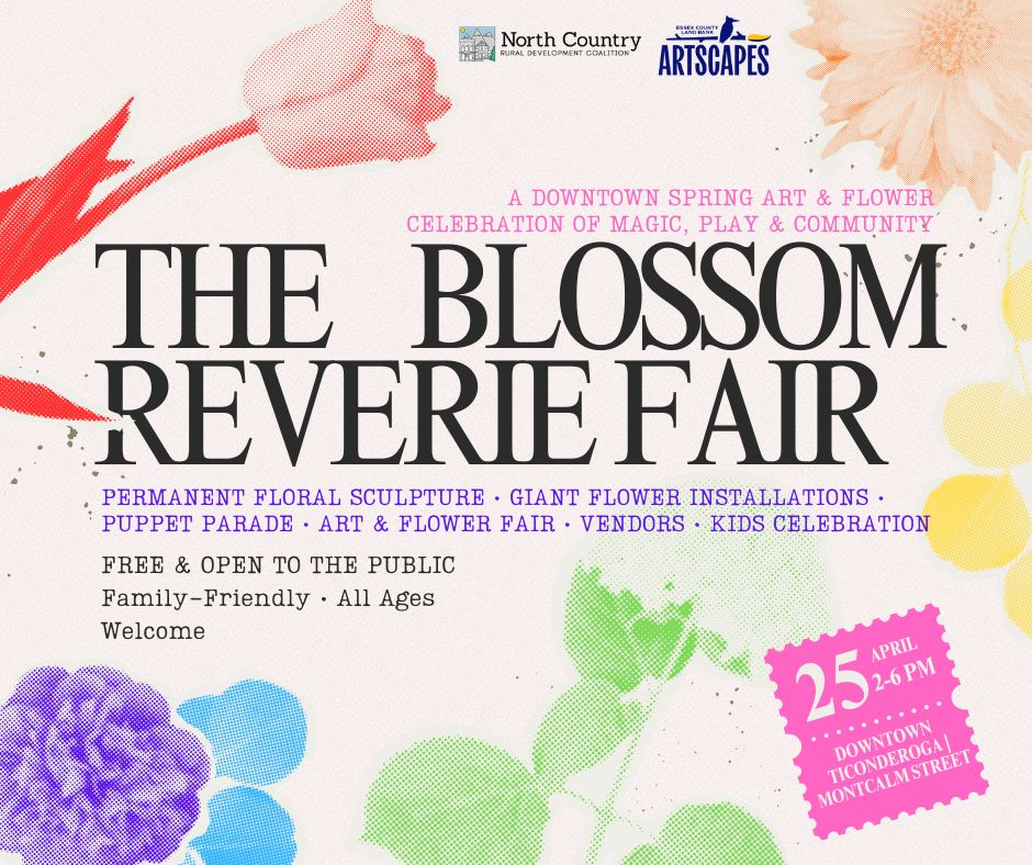 This one-day event will feature floral installations, giant puppetry, window art, live music, and local vendors, transforming downtown Ticonderoga into a garden of creativity and public engagement.